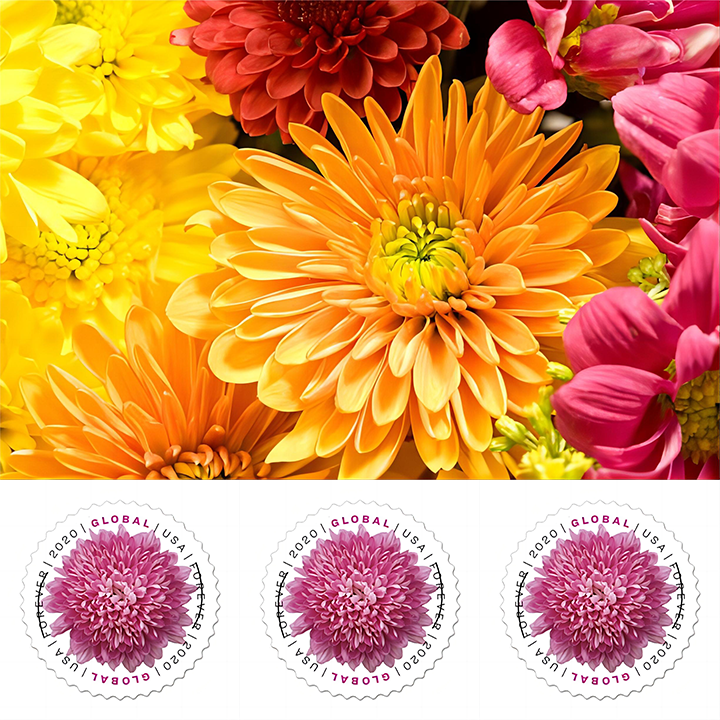 Chrysanthemums are beautiful plants mostly used for decoration, but there are some species with culinary uses, too.  Certain chrysanthemum flowers can be dried and used in tea, while the leaves of these plants can be sautéed or used in soups (most commonly in Chinese or Japanese cuisines). In 2020, the United States Postal Service pictured a chrysanthemum on a Global Forever stamp.  Given the flower's global popularity, it was a fitting choice.