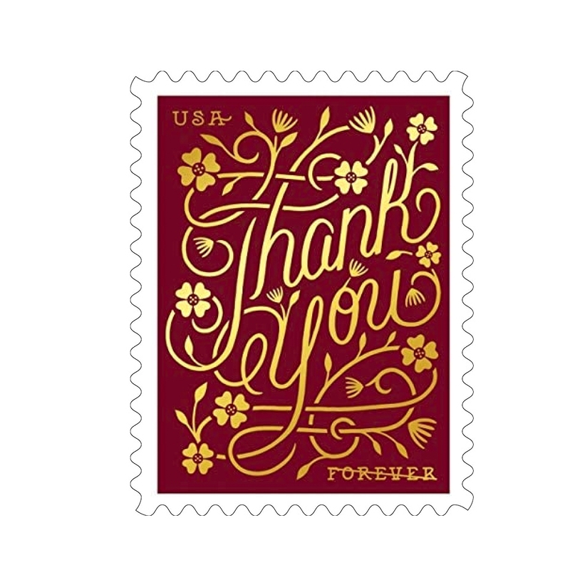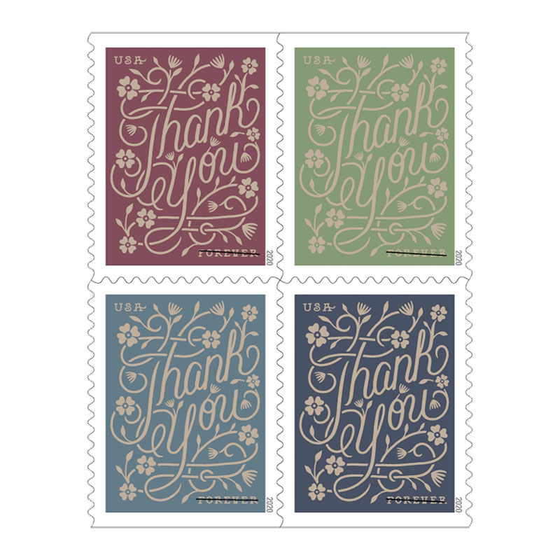 In 2020, the Postal Service issues four new stamps in a booklet of 20 available for notes, cards and letters of thanks sent to acknowledge a favor, an act of kindness, a job well done or gifts sent for any occasion. Highlighted in gold foil are the words, deep blue, muted green or soft maroon. Greg Breeding was the art director. Dana Tanamachi was the stamp designer and lettering artist.